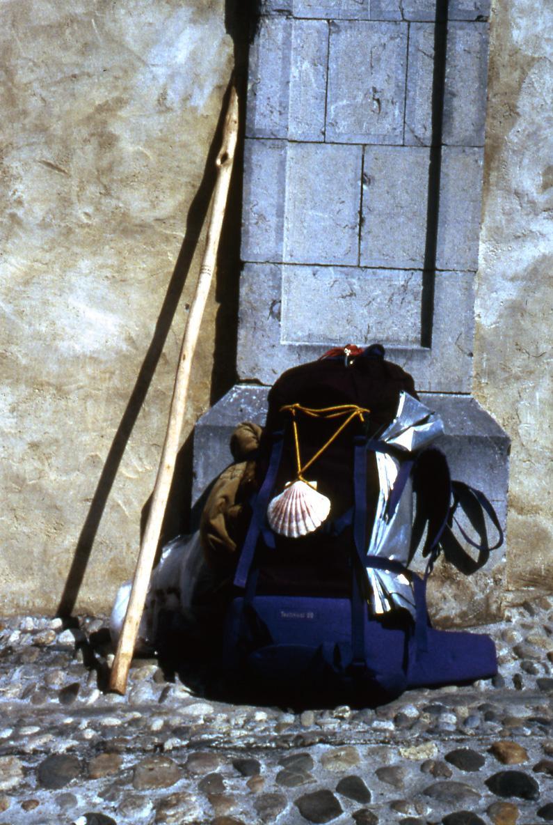 Saint-Bertrand-de-Comminges, 1999, sac et bâton de pèlerin de Saint-Jacques au parvis de la cathédrale. © M. Miossec Musée archéologique départemental